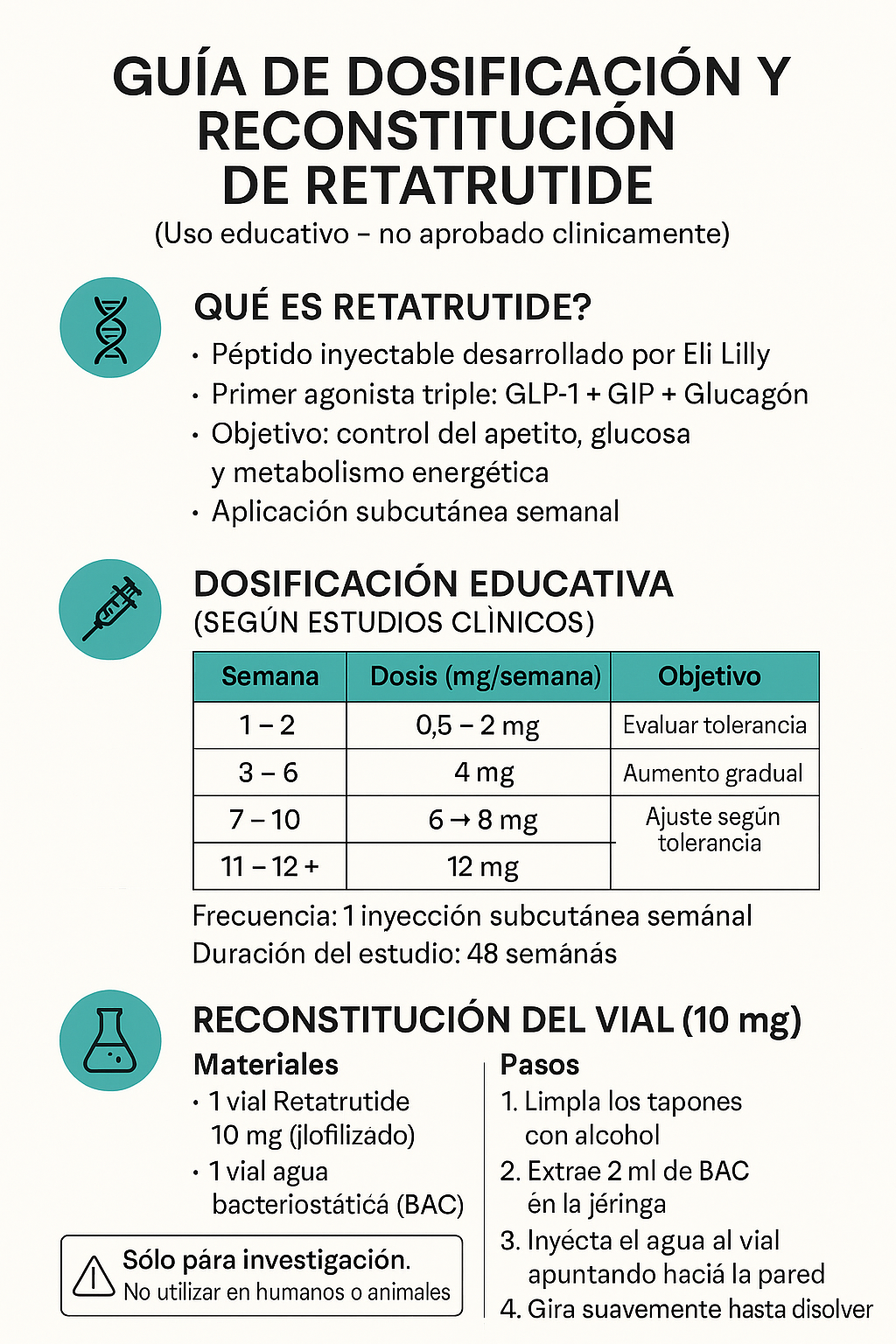 Aunque Retatrutide no está aprobado para uso clínico general, los estudios publicados ofrecen una guía educativa de cómo se administró en los ensayos.